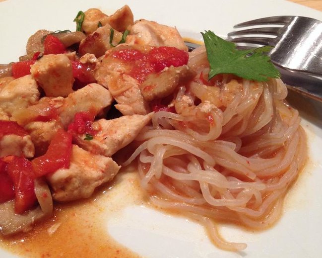 Blancs de poulet sautés aux poivrons rouges et champignons de Paris, accompagnés de ses spaghettis de Konjac