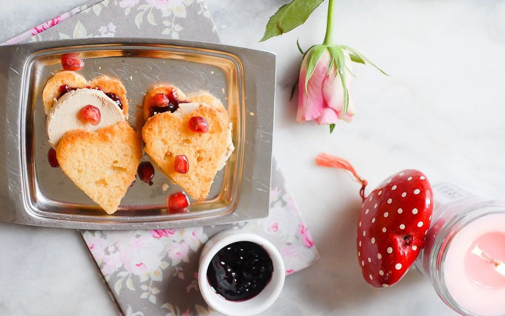 - Tartinez un coeur de quatre quarts de confiture, déposez un coeur de foie gras dessus, puis à nouveau un coeur de quatre quarts croustillant.