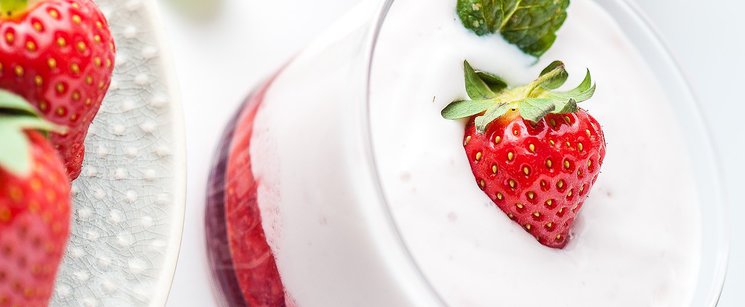 - Dans vos jolis verres, placez au fond un peu de compote de fraises, puis du yaourt fouetté et enfin déposez une fraise entière et une feuille de menthe.