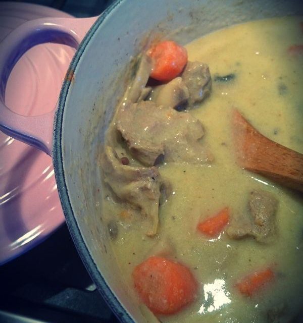 - Lorsque vous avez suffisamment de sauce blanche pour couvrir votre viande, transvaser celle ci dans votre cocotte. Elle sera liquide. C’est normal. Vous allez l’épaissir avec la maïzena.