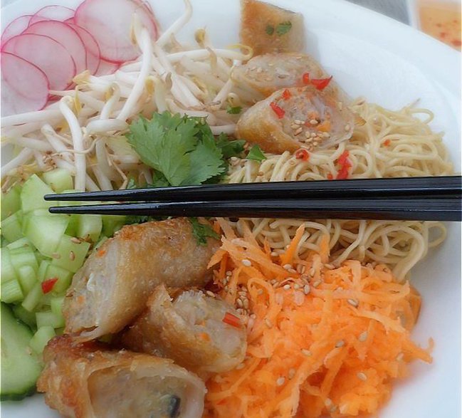- Dans vos assiettes creuses ou des grands bols déposez la salade, les carottes, le soja, les nouilles, le concombre, les radis, la coriandre et les nems de façon jolie.