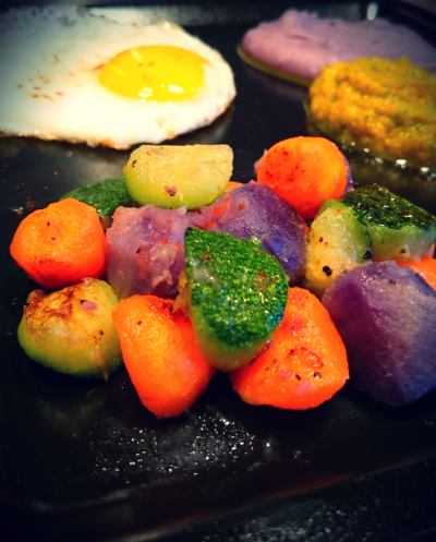 - Dans une assiette, mettez l’oeuf au plat, puis un peu de chaque légume en billes. Et enfin deux cuillères à soupe des deux purées.