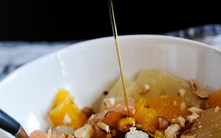 J’ai mis des oranges, des pamplemousses (rose et chinois), un jus de citron et des noisettes. Avec un peu de sirop d’érables et l’affaire était dévorée en moins de temps qu’il ne faut pour le dire…