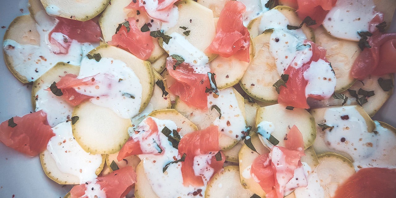 Salade gourmande de courgette, saumon fumé et sauce citron yaourt grec
