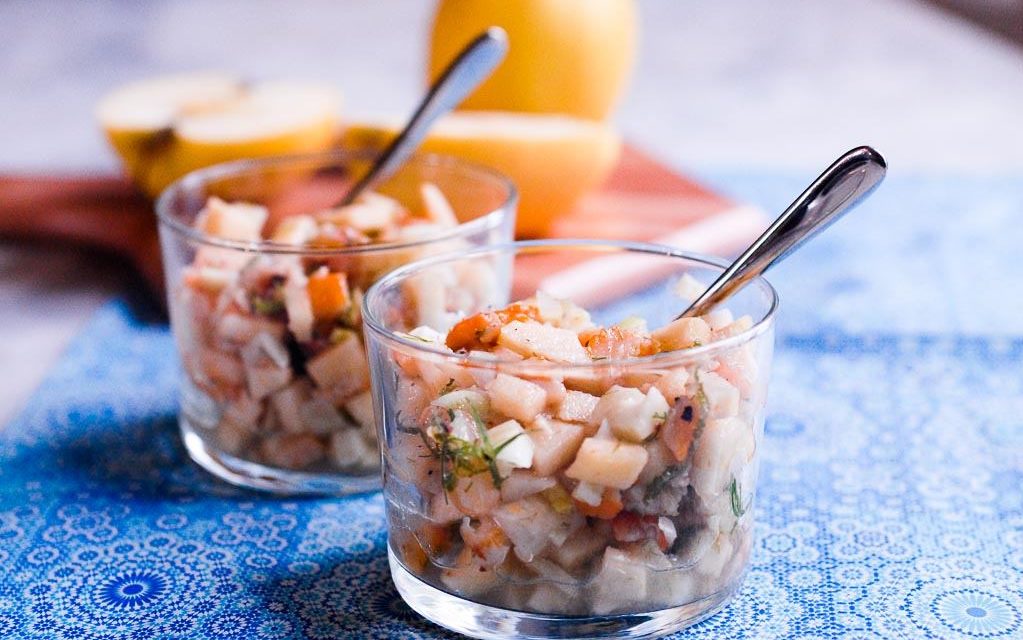 - Déposez un peu de salade au haddock fumé, pommes Tentation et fenouils dans des verrines