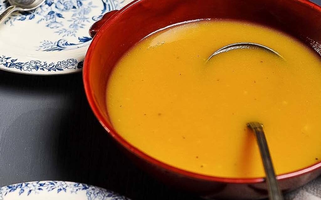 Soupe de butternut et de beurre d'arachide , le tout bien épicé