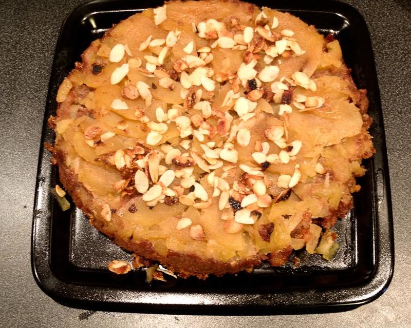 J’ai fait une tarte aux pommes façon Tatin, sur fond de gâteau tranché marbré Ker Cadélac® et lait de coco