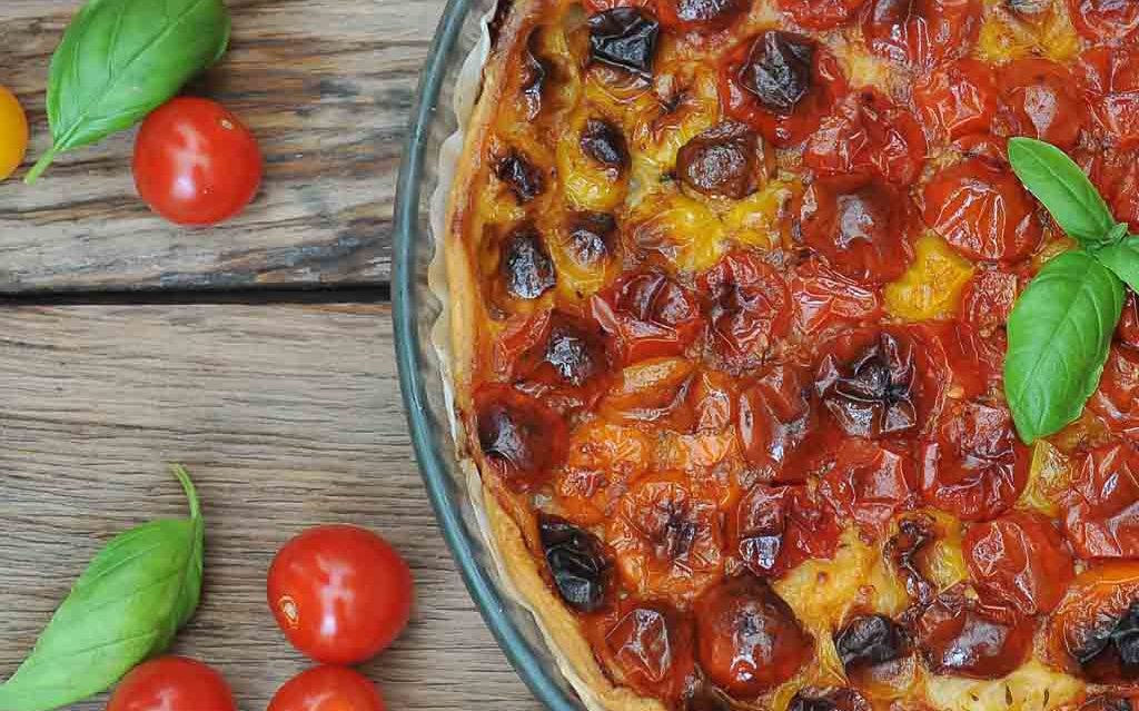 - Sortez la tarte du four, déposez quelques feuilles de basilic