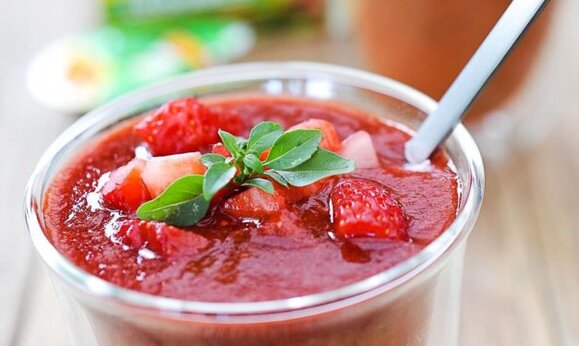 Une recette de Tomates et fraises en soupe froide avec un peu de vinaigre balsamique