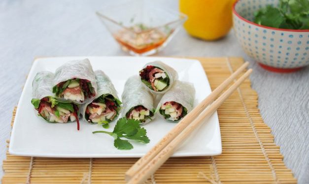 je me suis inspirée des rouleaux de printemps que l’on connait tous : Feuille de riz, cheveux d’anges, salade, menthe et crevette et j’ai fait … pas du tout pareil