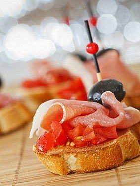 Une bruschetta est un hors-d’œuvre italien. Généralement une tartine de pain grillée frottée d’ail, arrosée d’huile d’olive et garnie de petits morceaux de tomates, assaisonnée de basilic.