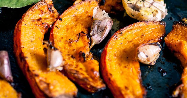 Un régal de tranches de potiron rôties au four, à l’ail , à l’huile d’olive et aux herbes du maquis.