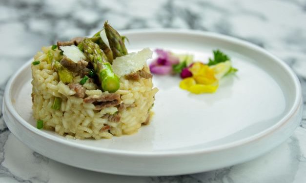 Une recette très simple mais tellement délicieuse du risotto d’agneau aux asperges vertes et parmesan