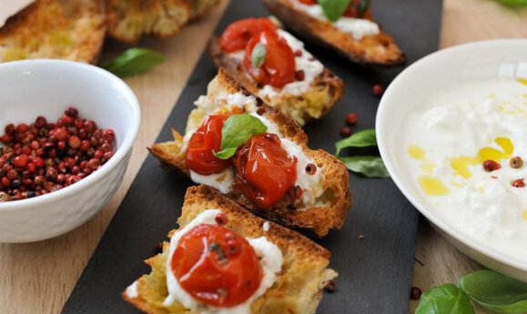 Bruschetta tomates cerise rôties au miel et stacciatella